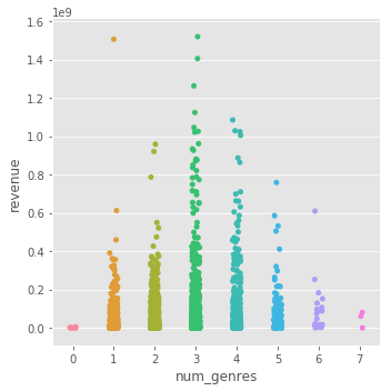 sns.catplot(x='num_genres',y='revenue',data=train)