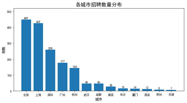 - “数据分析"这一岗位,主要集中在"北京”,“上海”,“深圳”,“广州”,"杭州"五大一线城市,北京与上海岗位最多