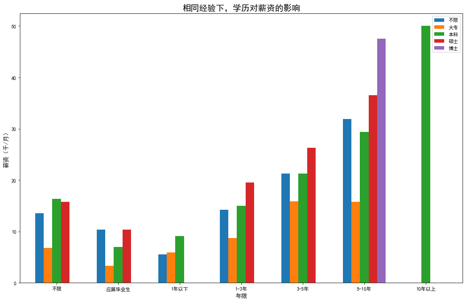 plt.title("相同经验下,学历对薪资的影响",fontsize=17)