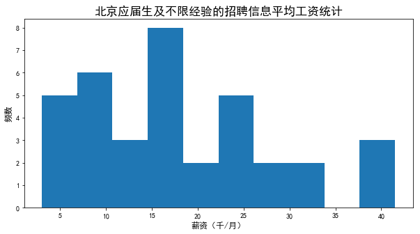 plt.title('北京应届生及不限经验的招聘信息平均工资统计', size=17)