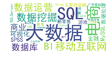 - 根据企业打的技能标签,大多数企业主要希望招聘者有以下技能:数据库的应用,数据处理,数据运营,数据挖掘算法,数据可视化,业务层面,对电商,金融行业的理解