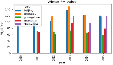 数据主要集中在2012年到2015年,且春季和冬季的PM值要比夏季和秋季的PM值要大,说明春季的冬季的污染情况较为严重。总体来看,无论是哪个季节,总体的PM值都有随年份减小的趋势,说明污染在减缓。
