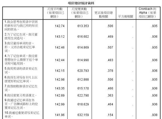 该表格包含了修改问卷的重要信息,是信度分析中重要的分析结果。这个表格中,最终要的就是最后两列的数值,这是对问卷题目进行删除或修改的依据。以第10题为例说明,第十题的“更正后与项目总数相关”为0.154,说明第10题与其它题目总分的相关系数是非常低的,这是对第10题进行修改的重要依据。可以观察其它题的该项数值,都比第10题高出不少。再看第10题的最后一项数值为0.938,表明如果将第10题删除,克朗巴哈系数将上升(根据公式可知,题目数越少,克朗巴哈系数越小),说明第10题与问卷其它题目的内部一致性较差,也就是相关性较差。因此,如果对问卷进行删除或修改,首先应该考虑第10题。但是,在该题中,卡朗巴哈系数已经非常高,所以再对问卷进行修改的意义不大。