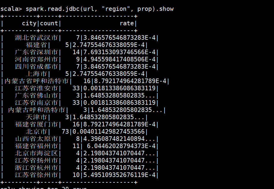 grouped.orderBy(grouped("count").desc).withColumn("rate", rate(grouped.col("count"))).write.mode("overwrite").jdbc(url, "region", prop)