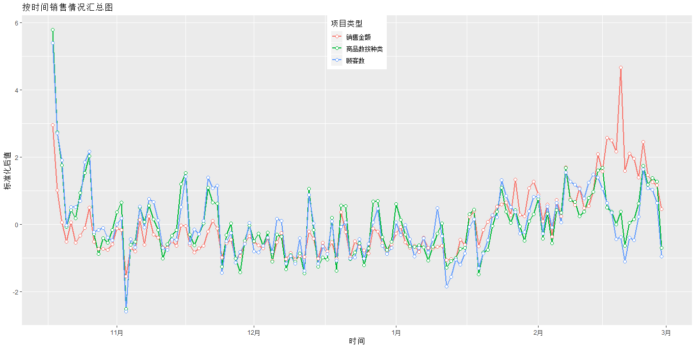 labs(y="标准化后值",x="时间",color="项目类型")+