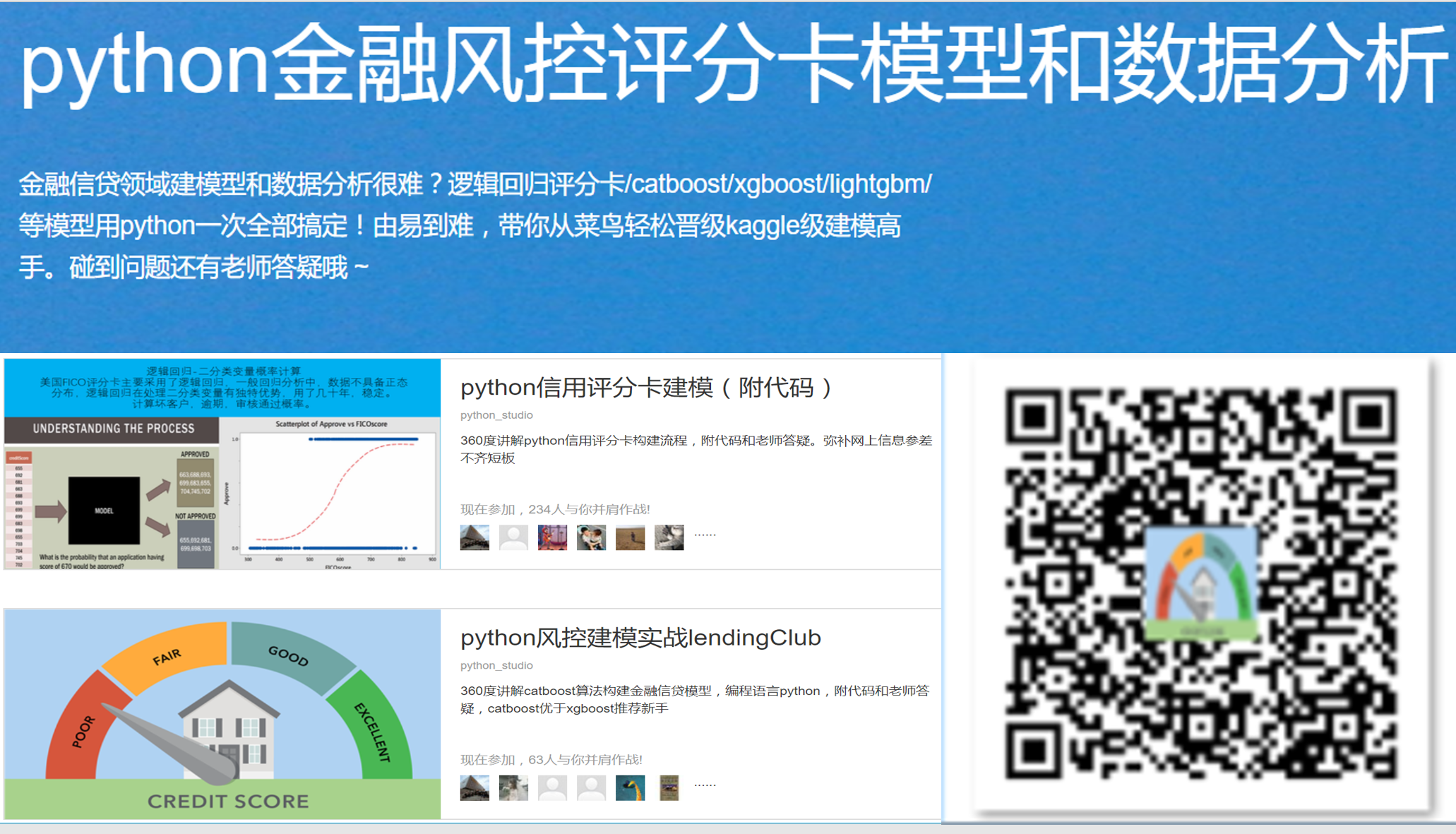 python金融风控评分卡模型和数据分析微专业课包含《python信用评分卡建模(附代码)》,《python风控建模实战lendingClub》,《金融现金贷用户数据分析和画像》三套课程系列,共计250节课左右,录制时间超过3年,定期更新。这套微专业课程是互联网上最全,最专业的python信贷建模教程。