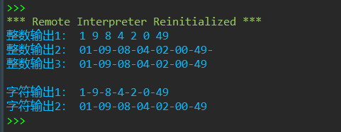 #task2:基础练习:列表、格式化、类型转换 实验内容 x = [1,9,8,4,2,0,49] print('整数输出1:', end = ' ') i = 0 while i < len(x): print(x[i], end = ' ') i +=1 print('\n整数输出2:', end = ' ') i = 0 while i <len(x): print(f'{x[i]:02d}', end = '-') #指定每个整数宽度占2列;不足2列,左边补0 i += 1 print('\n整数输出3:',end = ' ') i = 0 while i <len(x) - 1: print(f'{x[i]:02d}', end = '-') i += 1 print(f'{x[-1]:02d}') print('\n字符输出1:', end = ' ') y1 = [] i = 0 while i < len(x): y1.append(str(x[i])) #函数str()用于把其它类型对象转化为字符串对象 i += 1 print('-'.join(y1)) print('字符输出2:', end = ' ') y2 = [] i = 0 while i < len(x): y2.append(str(x[i]).zfill(2)) #x[i]是int类型对象,使用str()转换成字符串对象后,处理,然后加入到列表y中 i += 1 print('-'.join(y2))