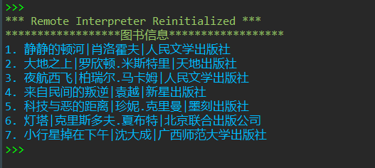 book_list = [['静静的顿河','肖洛霍夫','金人', '人民文学出版社'], ['大地之上','罗欣顿.米斯特里','张亦琦', '天地出版社'], ['夜航西飞', '柏瑞尔.马卡姆', '陶立夏', '人民文学出版社'], ['来自民间的叛逆', '袁越', '','新星出版社'], ['科技与恶的距离', '珍妮.克里曼', ' 詹蕎語', '墨刻出版社'], ['灯塔','克里斯多夫.夏布特','吕俊君','北京联合出版公司'], ['小行星掉在下午','沈大成', '', '广西师范大学出版社']] print(f"{'图书信息':*^40}") import copy b = copy.deepcopy(book_list) #后续del操作会对book-list修改,因此此处先保存原有的book-list,待del操作后再还原,以便需要查询原book-list时可以查到 i = 0 while i < len(book_list): a = book_list[i] del(a[2]) print(f'{i + 1}. {"|".join(a)}') i += 1 book_list = b
