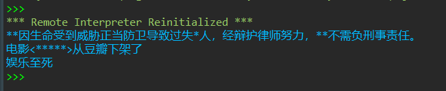 words_sensitive_list = ['张三', 'V字仇杀队', '杀'] comments_list = ['张三因生命受到威胁正当防卫导致过失杀人,经辩护律师努力,张三不需负刑事责任。', '电影<V字仇杀队>从豆瓣下架了', '娱乐至死'] ls = [] j = 0 while j < len(comments_list): i = 0 b = comments_list[j] while i < len(words_sensitive_list): a = words_sensitive_list[i] if a in b: b = b.replace(a, '*'*len(a)) i += 1 else: i += 1 ls.append(b) j += 1 for i in ls: print(i)