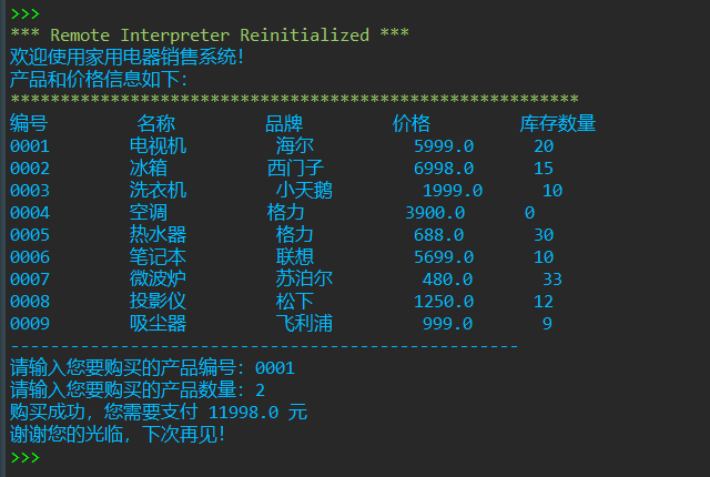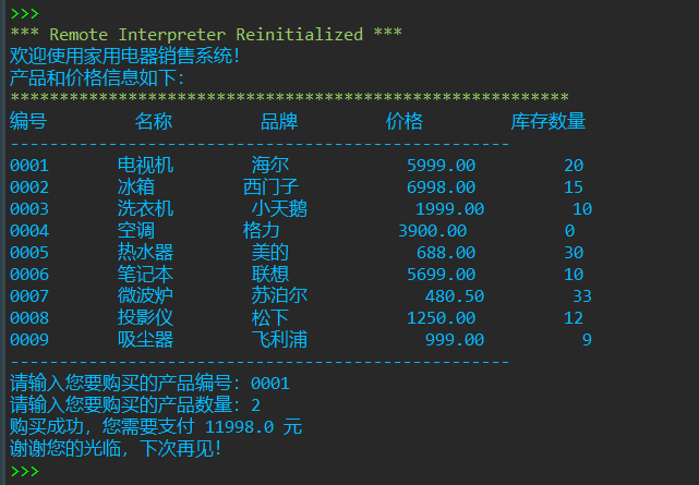 """ 家用电器销售系统 v1.1 """ #欢迎信息 print('欢迎使用家用电器销售系统!') #商品数据 products=[ ['0001','电视机','海尔',5999.00,20], ['0002','冰箱','西门子',6998.00,15], ['0003','洗衣机','小天鹅',1999.00,10], ['0004','空调','格力',3900.00,0], ['0005','热水器','格力',688.00,30], ['0006','笔记本','联想',5699.00,10], ['0007','微波炉','苏泊尔',480.00,33], ['0008','投影仪','松下',1250.00,12], ['0009','吸尘器','飞利浦',999.00,9] ] #产品信息列表 print('产品和价格信息如下:') print('*'*57) print(f"{'编号': <10} {'名称': <10} {'品牌': <10} {'价格': <10} {'库存数量': <10} ") for i in products: j = 0 while j < len(i): print(i[j], end = ' '*(12 - len(str(i[j])))) j += 1 print('',end = '\n') print('-'*51) #用户输入信息 product_id = input('请输入您要购买的产品编号:') count = int(input('请输入您要购买的产品数量:')) #输入编号对应商品的信息 product_index = int(product_id) - 1 product = products[product_index] #计算金额 print('购买成功,您需要支付', product[3]*count, '元') #退出系统 print('谢谢您的光临,下次再见!')
