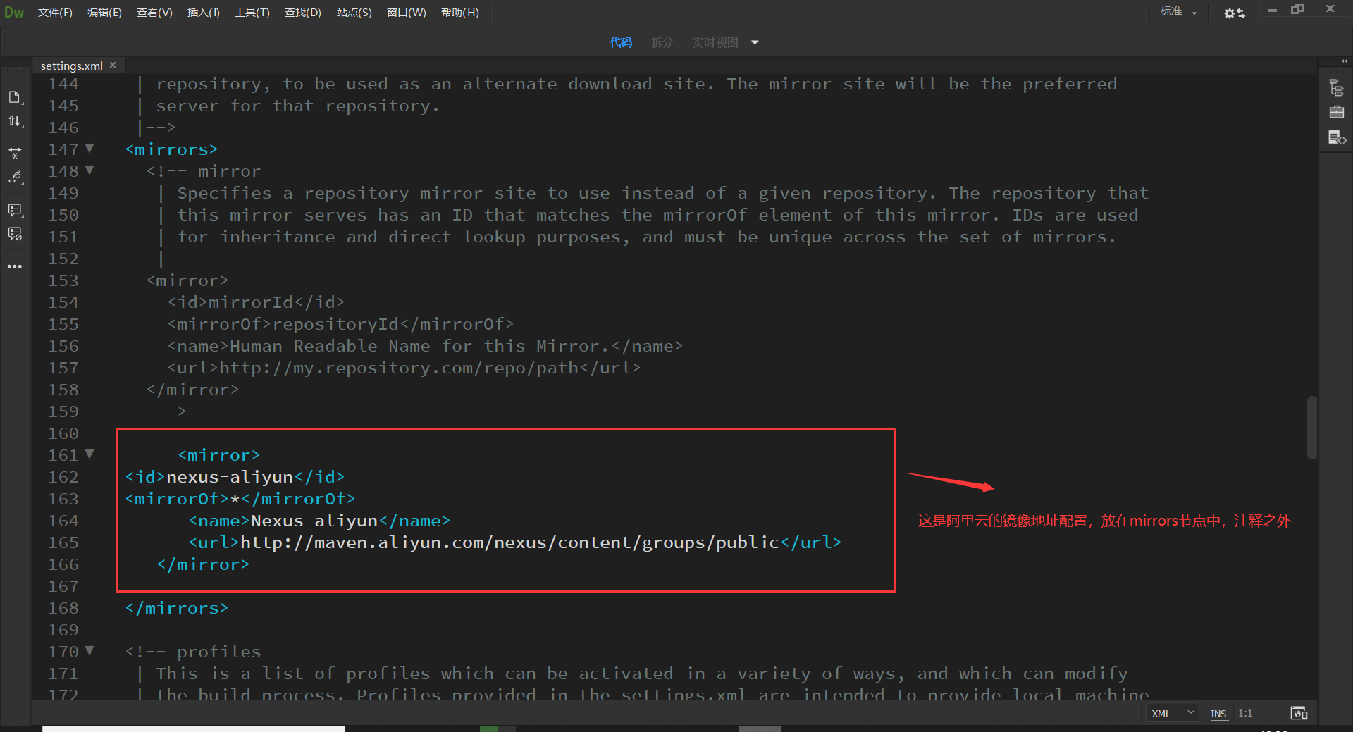配置远程下载镜像地址,这里一般用阿里云的,下载jar包快,复制以下加入