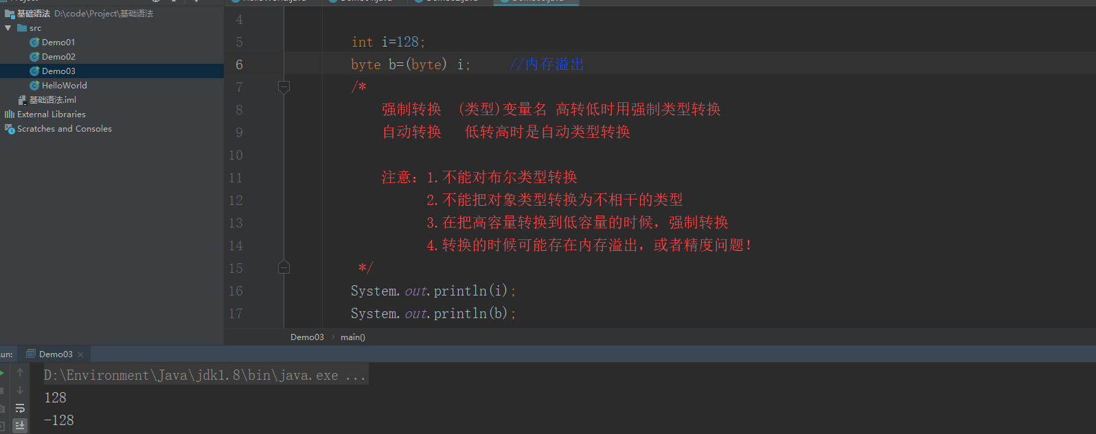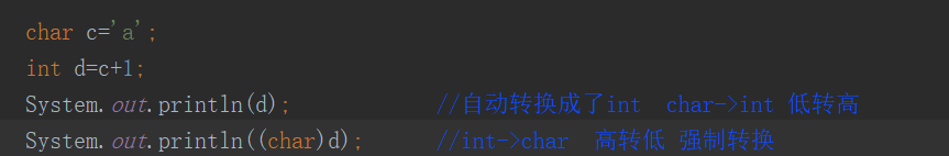 类型转换分为:1.强类型转换 语法:(类型)变量名 高转低时用强制类型转换