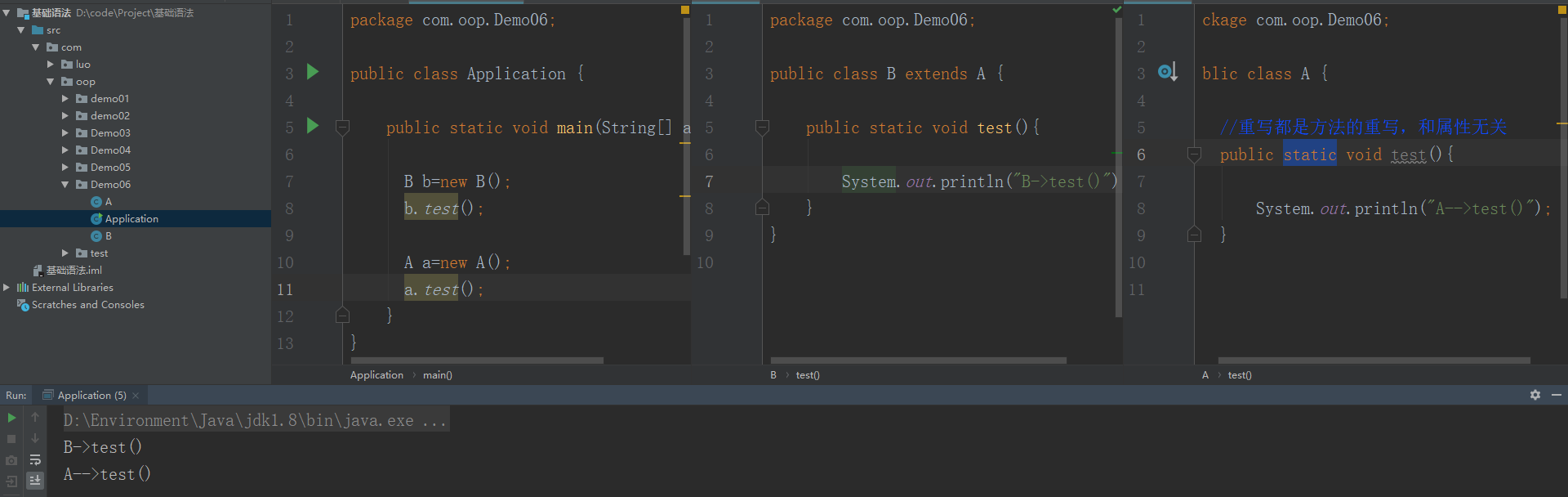 静态方法:方法的调用只和左边,定义的数据类型有关。