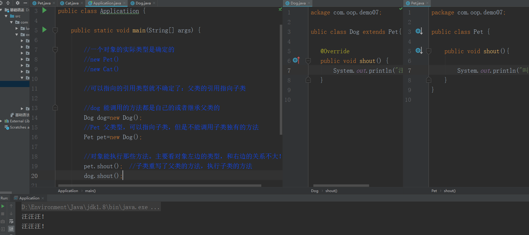 一个对象的实际类型是确定的,但可以指向对象的引用的类型有很多(父类,有关系的)。