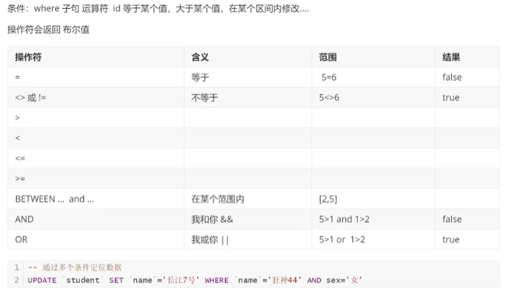 不指定条件的情况下,会改动所有表,修改多个属性,逗号隔开