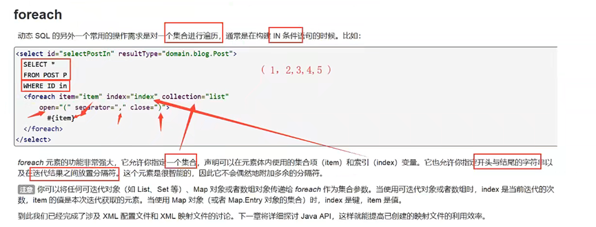 动态 SQL 的另一个常见使用场景是对集合进行遍历(尤其是在构建 IN 条件语句的时候)。