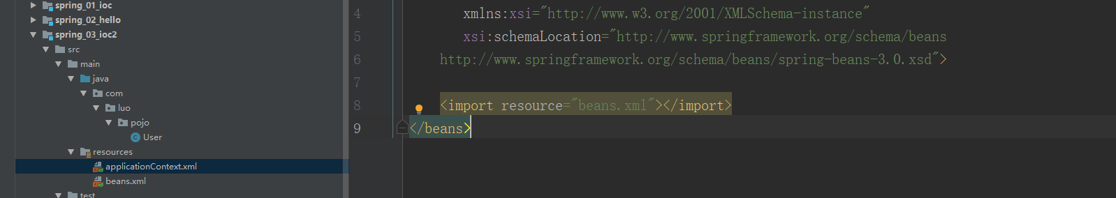 假设,现在项目中有多个人开发,这三个人复制不同的类型开发,不同的类需要注册在不同的bean中,我们可以利用import将所有人的beans.xml合并为一个总的!
