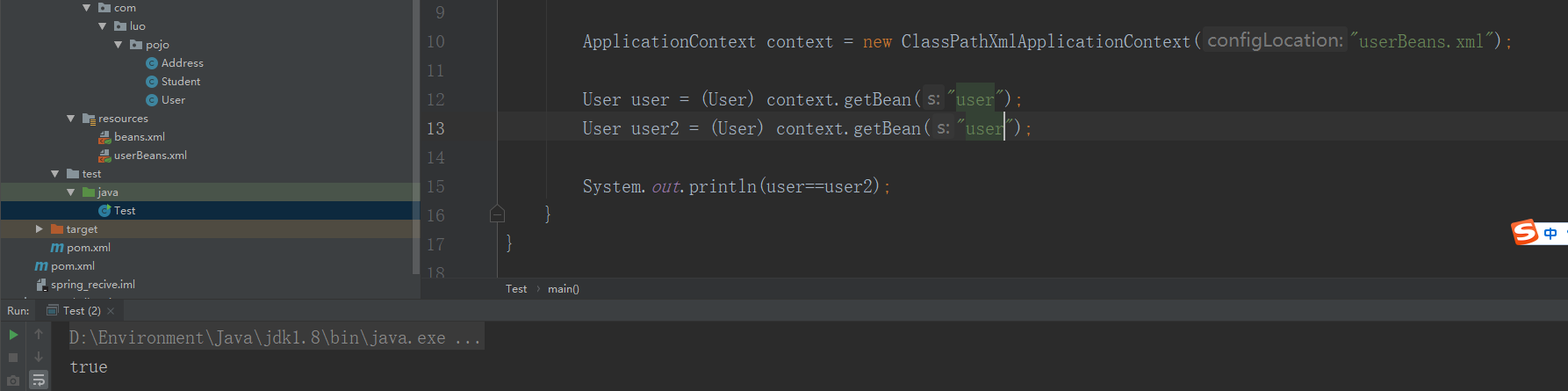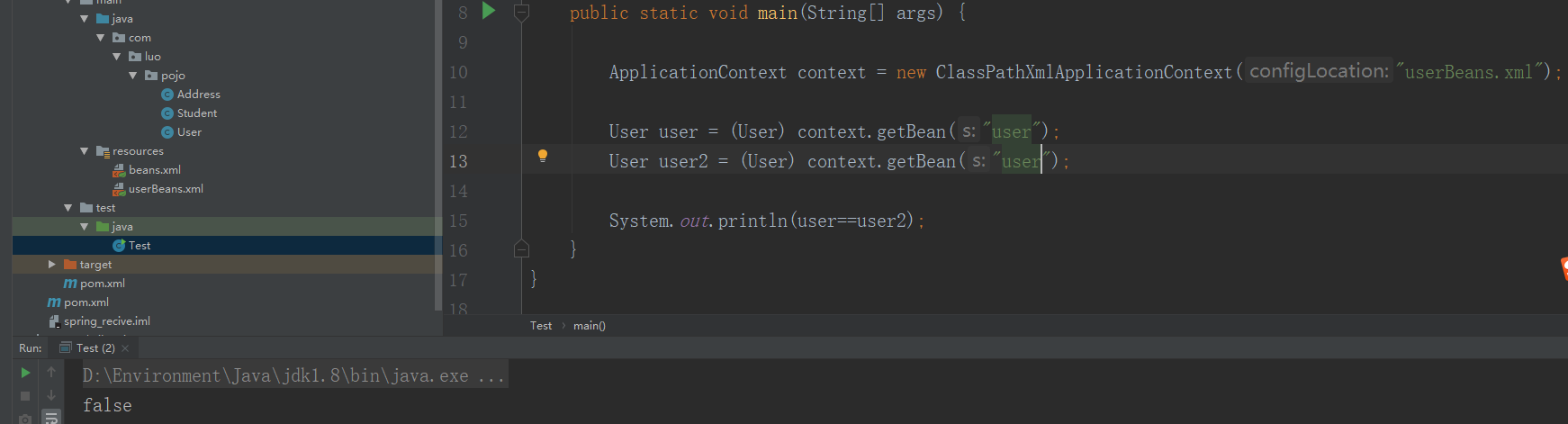 <bean id="user" class="com.luo.pojo.User" c:name="学生" scope="singleton"></bean>测试可以发现单例模式,在Spring容器中只有一个实例