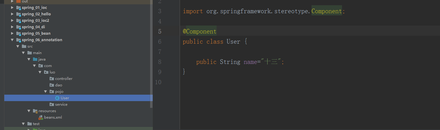 @Component等价于<bean id="user" class="com.luo.pojo.User"></bean>