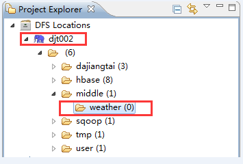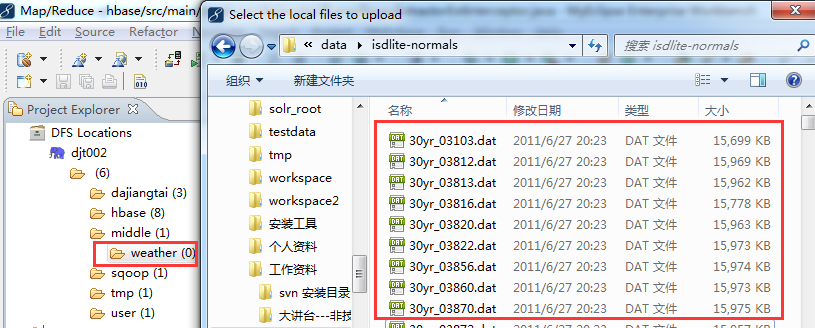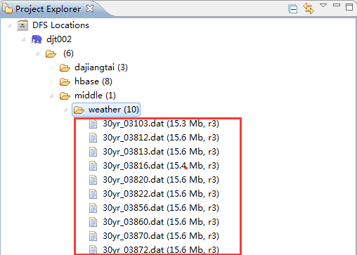 规划好气象站数据集在HDFS中的目录结构(hdfs://djt002:9000/middle/weather),然后右键点击weather目录选择Upload files to DFS,最后选中需要上传的气象站数据集。