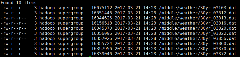 [hadoop@djt002 hadoop]$ bin/hdfs dfs -ls /middle/weather/