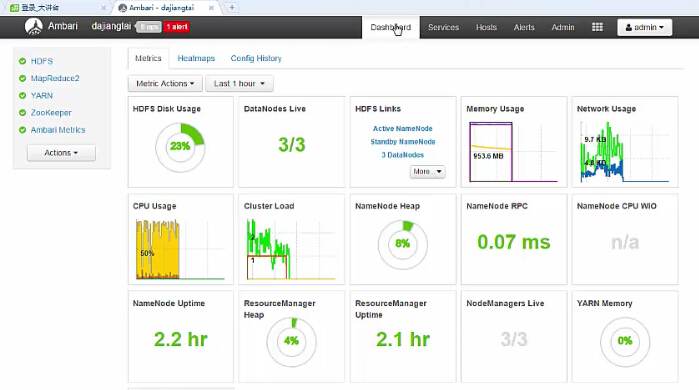 Ambari 仪表盘和监视器工具为我们提供了比较直观的Hadoop集群信息。一旦Hadoop 集群启动,Ambari可以监控整个集群的健康状况。