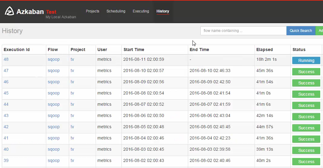 另外我们还可以通过Azkaban 来负责MapReduce的作业调度,同时它能提供MapReduce运行信息和详细的执行日志,包括运行时间。
