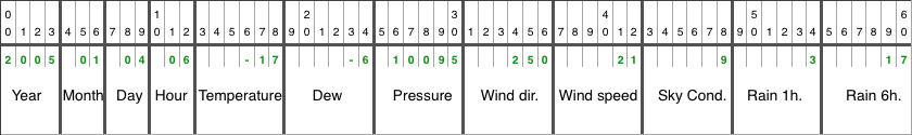 1998 #year 03 #month 09 #day 17 #hour 11 #temperature -100 #dew 10237 #pressure 60 #wind_direction 72 #wind_speed 0 #sky_condition 0 #rain_1h -9999 #rain_6h