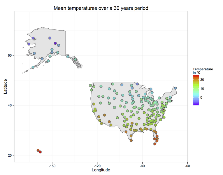 可视化结果展示了美国所有气象站30年来的平均气温。