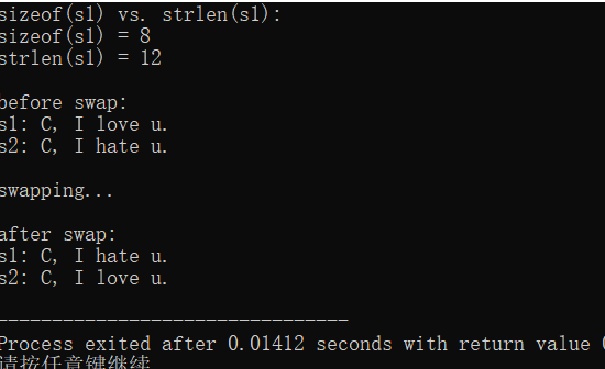 #include <stdio.h> #include <string.h> #define N 80 int main() { char s1[] = "C, I love u."; char s2[] = "C, I hate u."; char tmp[N]; printf("sizeof(s1) vs. strlen(s1): \n"); printf("sizeof(s1) = %d\n", sizeof(s1)); printf("strlen(s1) = %d\n", strlen(s1)); printf("\nbefore swap: \n"); printf("s1: %s\n", s1); printf("s2: %s\n", s2); printf("\nswapping...\n"); strcpy(tmp, s1); strcpy(s1, s2); strcpy(s2, tmp); printf("\nafter swap: \n"); printf("s1: %s\n", s1); printf("s2: %s\n", s2); return 0; }