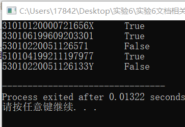 #include <stdio.h> #include <string.h> #define N 5 int check_id(char *str); // 函数声明 int main() { char *pid[N] = {"31010120000721656X", "330106199609203301", "53010220051126571", "510104199211197977", "53010220051126133Y"}; int i; for(i=0; i<N; ++i) if( check_id(pid[i]) ) // 函数调用 printf("%s\tTrue\n", pid[i]); else printf("%s\tFalse\n", pid[i]); return 0; } // 函数定义 // 功能: 检查指针str指向的身份证号码串形式上是否合法。 // 形式合法,返回1,否则,返回0 int check_id(char *str) { int i,flag=1; if(strlen(str)==18) { for(i=0;i<18;++i,str++) { if(*(str)>='0'&&*(str)<='9'||*(str)==88) flag=1; else { flag=0; break; } } } else flag=0; return flag; }