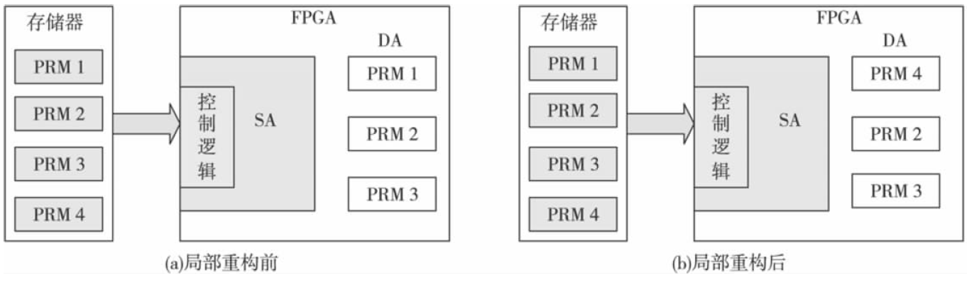 动态区域中含有若干个可重调整的模块(PRM) ,是局部重构的修改对象,局部重构前动态区域中注入的是PRM1 ~ PRM3,经过局部重构将其中的PRM1 变为PRM4 ,实现局部功能的更改;