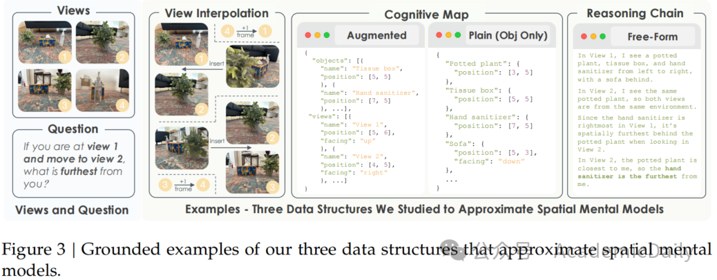 为帮助冻结的VLMs从有限视图构建空间心理模型,研究提出三种结构化数据作为认知支架(图3):
