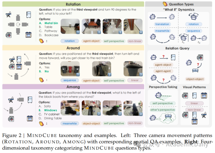 利用 MINDCUBE,我们框架评估了 VLMs 通过表征位置(认知映射)、方向(视角获取)和动态(“假设” 运动的心理模拟)来构建稳健空间心理模型的能力。