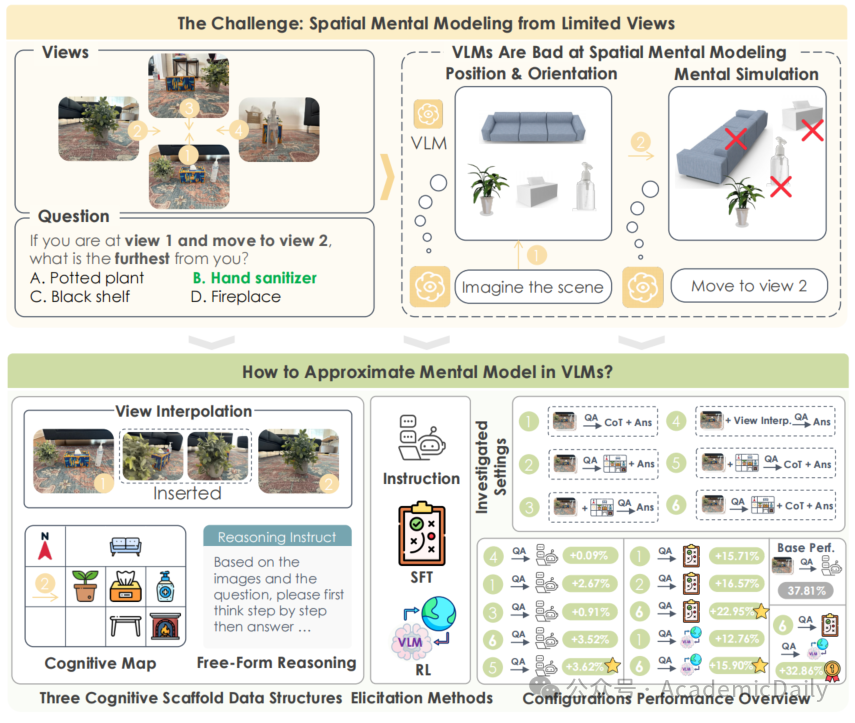 核心见解是,这种空间心理模型的支架,即主动构建和利用具有灵活推理过程的内部结构化空间表征,可显著改善对不可观测空间的理解。