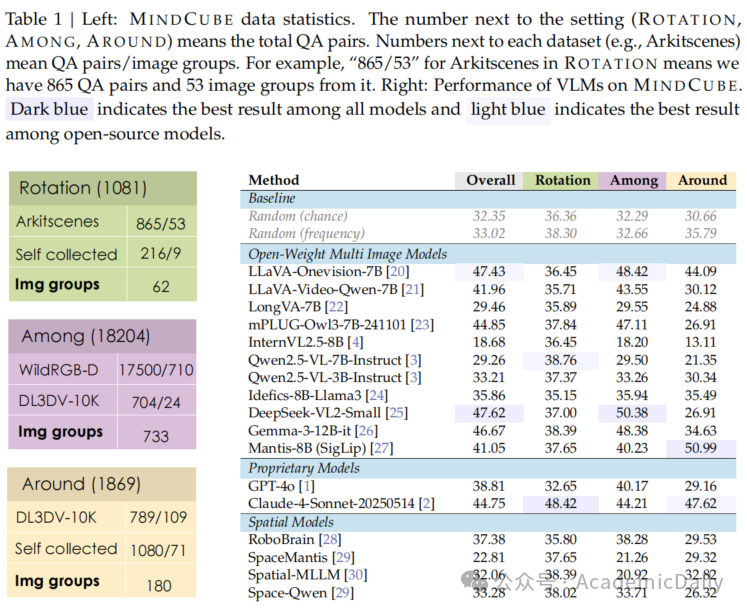 17个主流VLMs(如LLaVA、GPT-4o、DeepSeek-VL2)在MINDCUBE上表现普遍不佳,最高准确率为47.62%(DeepSeek-VL2-Small),远低于人类水平(94.55%)。
