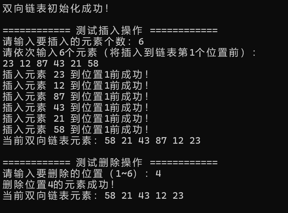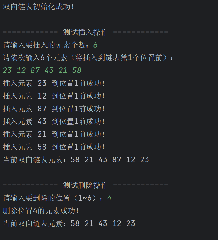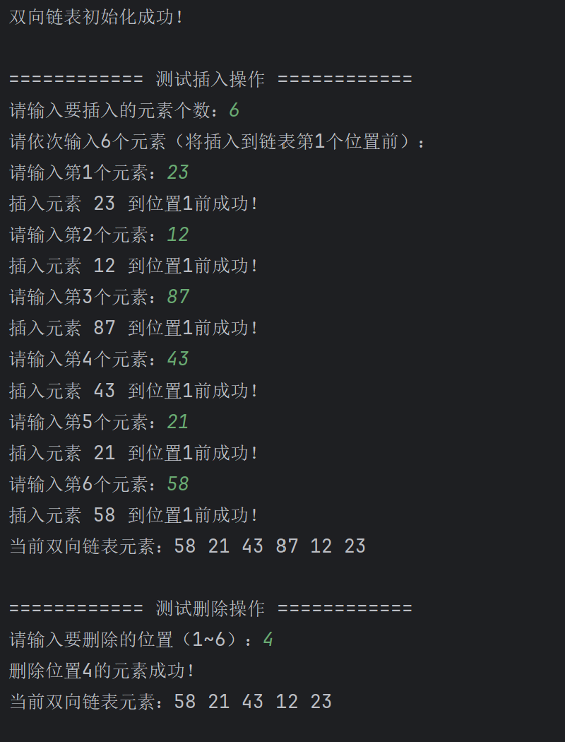 功能:在第i个节点之前插入新元素e。核心思路:双向链表插入需修改 4 个指针(新节点的前驱 / 后继、前驱节点的后继、后继节点的前驱),分两种场景处理。