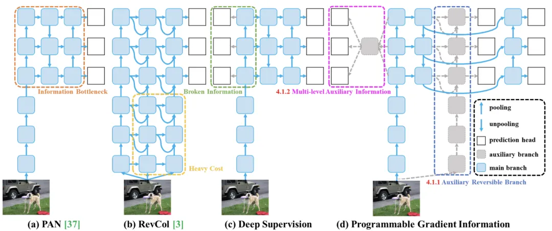 PGI和相关的网络架构及途径。(a)路径聚合网络(PAN),(b)可逆列(RevCol),(c)常规深度监控,以及(d)我们提出的可编程梯度信息(PGI)。PGI主要由三个部分组成:(1)主分支:用于推理的架构,(2)辅助可逆分支:生成可靠的梯度,为主分支提供反向传输,(3)多级辅助信息:控制主分支学习可规划的多级语义信息