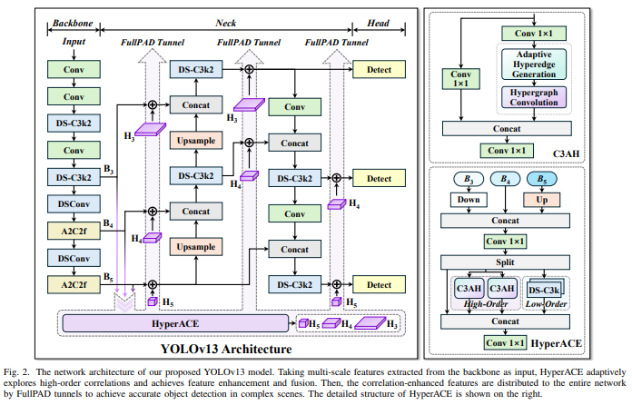 YOLOv13模型网络架构。HyperACE以骨干网提取的多尺度特征为输入,自适应地探索高阶相关性,达成特征增强和融合。继而,通过FullPAD隧道将相关增强特征分布到整个网络中,以实现复杂场景中的精确目标检测。HyperACE的详细结构如右图所示。