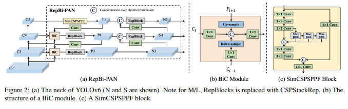 (a) YOLOv6 的 neck(显示了 N 和 S)。请注意,对于 M/L,RepBlocks 被替换为 CSPStackRep。