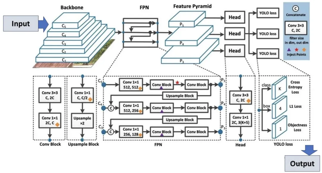 YOLOv8 架构:展示关键组件及其连接。 主干网络通过多个卷积层(C1至C5)处理输入图像,提取层次特征。然后这些特征经过特征金字塔网络(FPN)创建特征金字塔(P3、P4、P5),从而增强不同尺度的检测。网络头执行最终预测,结合卷积块和上采样块来细化特征