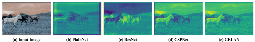 不同网络架构的随机初始权重输出特征图的可视化结果:(a)输入图像(b)PlainNet(c)ResNet(d)CSPNet,以及(e)GELAN。从图中行看出,在不同的架构中,提供给目标函数以计算损失的信息会不同程度地丢失,我们的架构许可保留最完整的信息,并为计算目标函数提供最可靠的梯度信息