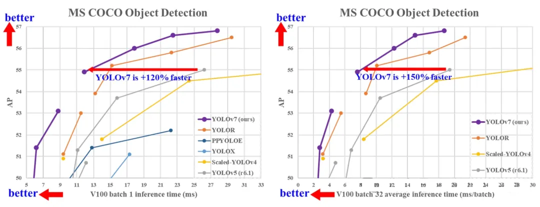 效率: YOLOv7 提出的办法可以有效地减少约 40% 的参数和 50% 的最先进的实时目标检测器的计算量,并且具有更快的推理速度和更高的检测精度。