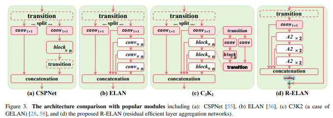 与流行模块的架构比较,包括(a):CSPNet(b)ELAN(c)C3K2(GELAN的一个例子)(d)R-ELAN(残差高效层聚合网络)