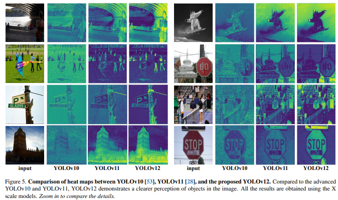 运用X尺度模型获得的就是YOLOv10、YOLOv11和拟议的YOLOv12之间的热图比较。与先进的YOLOv10和YOLOv11相比,YOLOv12对图像中的物体有更清晰的感知。所有结果都