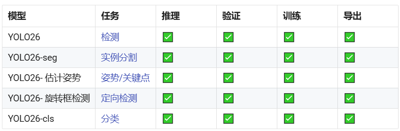 这一统一的框架确保 YOLO26 适用于实时检测、分割、分类、姿势估计 和面向对象检测,所有这些都支持训练、验证、推理和输出。