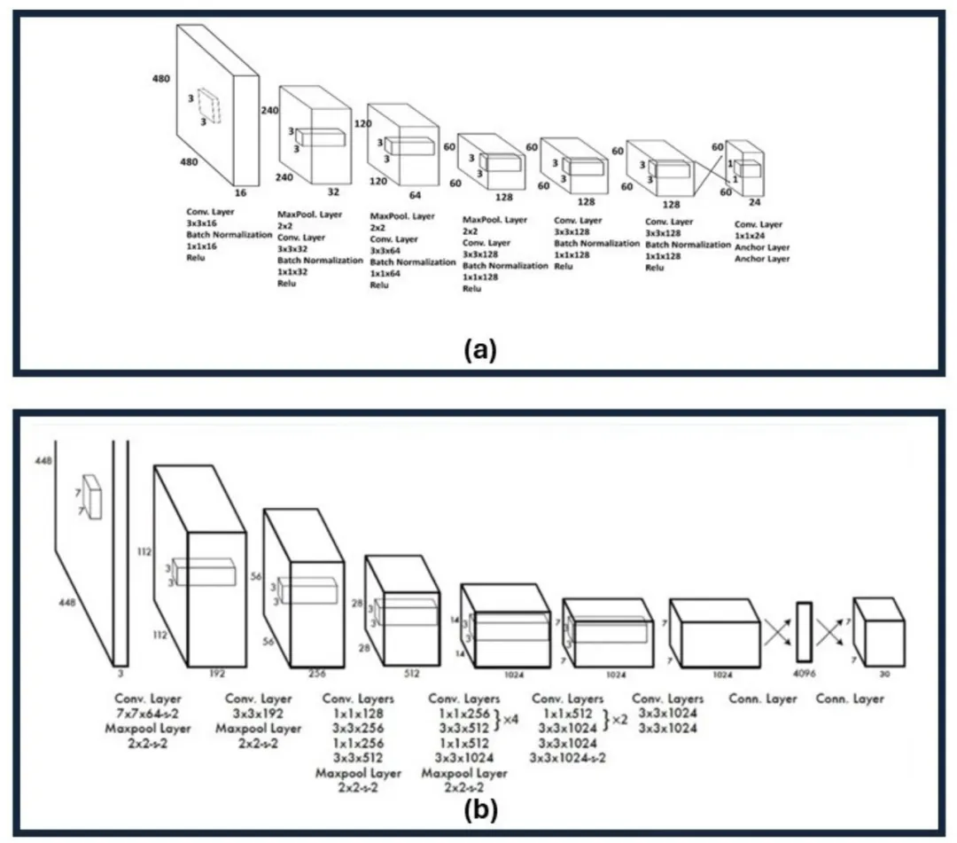 (a) YOLOv1 架构,显示了用于目标检测的卷积层、最大池层和全连接层的序列。该模型在一个统一的步骤中执行特征提取和预测,旨在完成实时性能。