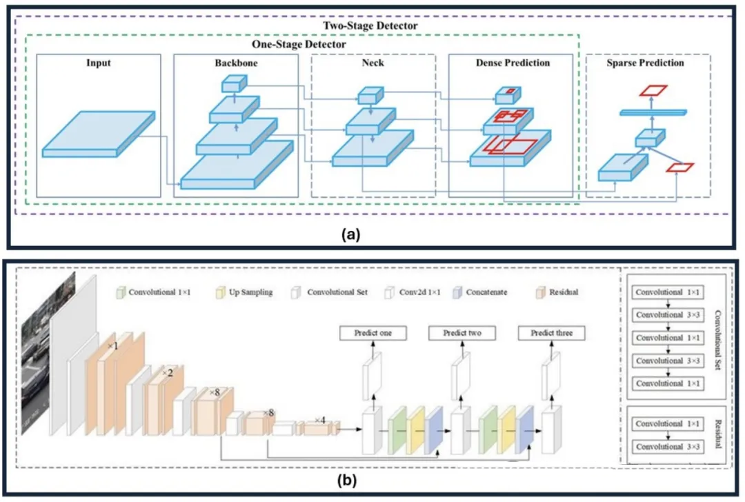 (b) YOLOv3 架构具有卷积层和上采样层,可实现多尺度预测。这凸显了两个版本之间在目标检测方面的结构进步