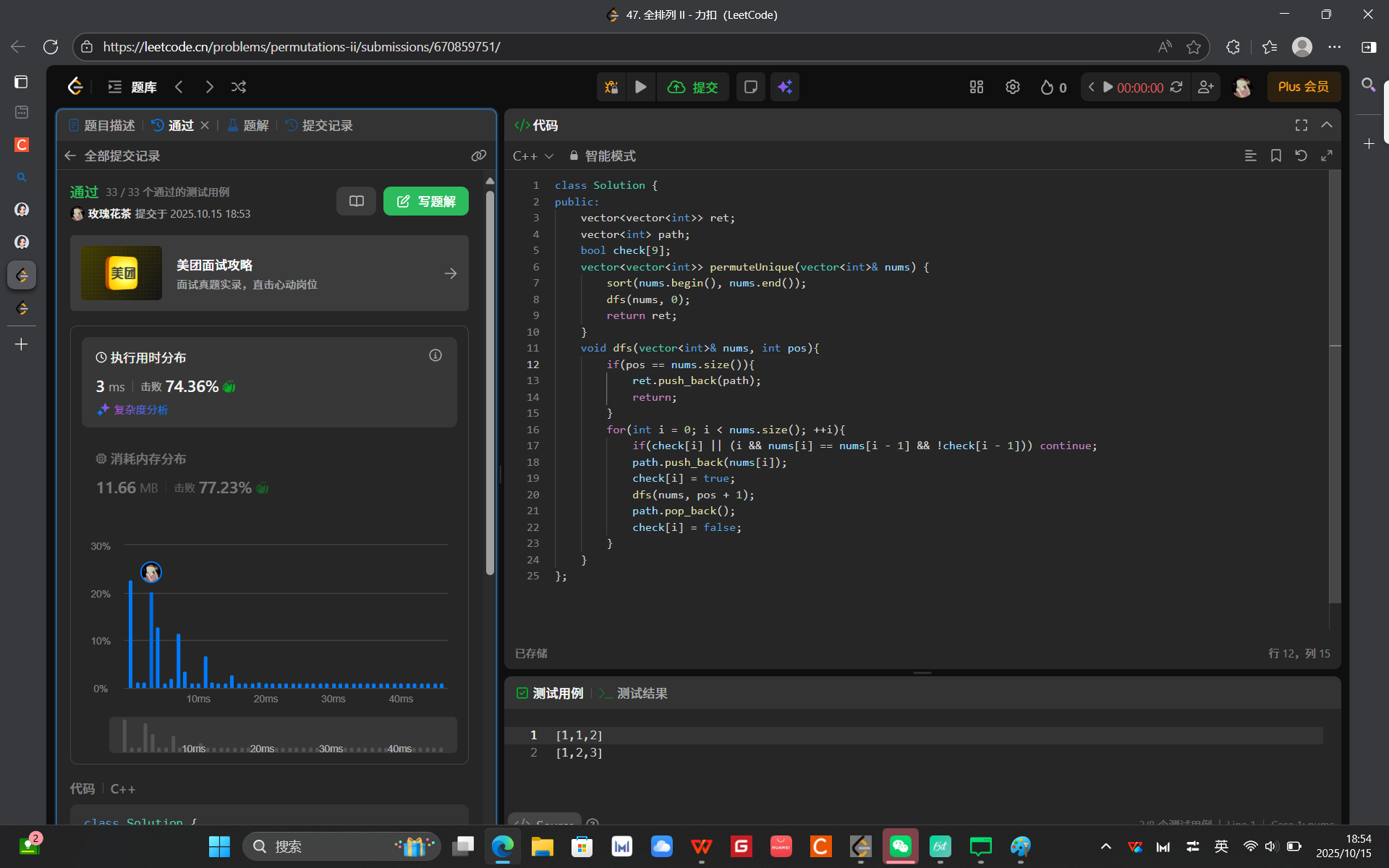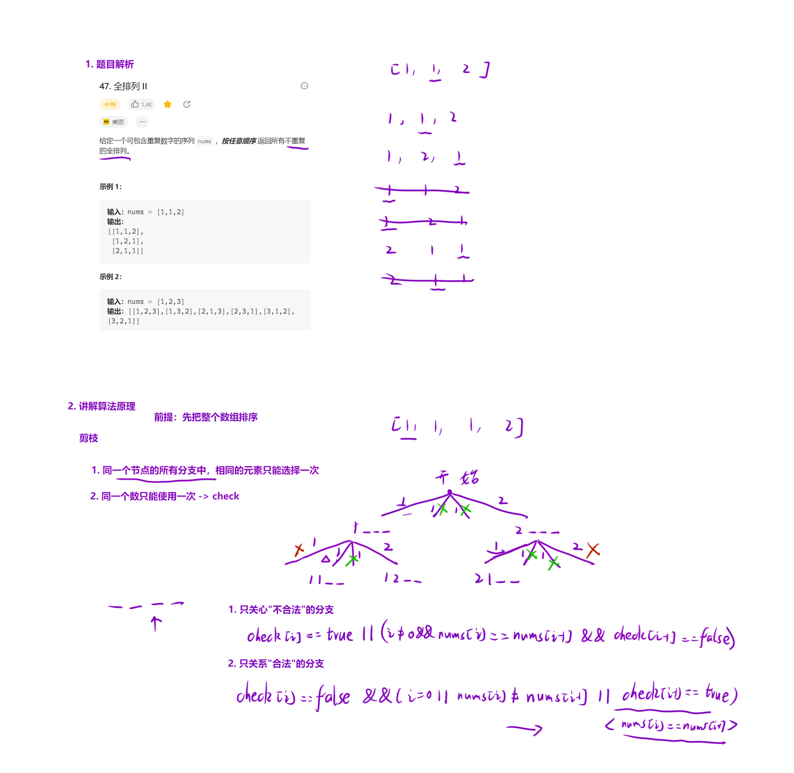 因题目不要求返回排列顺序,可先对初始状态排序,把相同元素放在相邻位置,方便后续操作。由于重复元素存在,全排列时可能出现重复排列。为避免这种情况,需对相同元素定义规则:相同元素按排序后的下标顺序出现在排列中,若元素 s 出现 x 次,排序后第 2 个 s 必在第 1 个 s 后,第 3 个 s 必在第 2 个 s 后,以此类推;若当前元素的前一个相同元素未出现在当前状态数组,当前元素也不能直接放入,保证相同元素排列顺序与排序后一致。通过深度优先搜索,枚举每个数在当前位置的可能性,递归结束时回溯到上一状态,直到枚举完所有可能性。