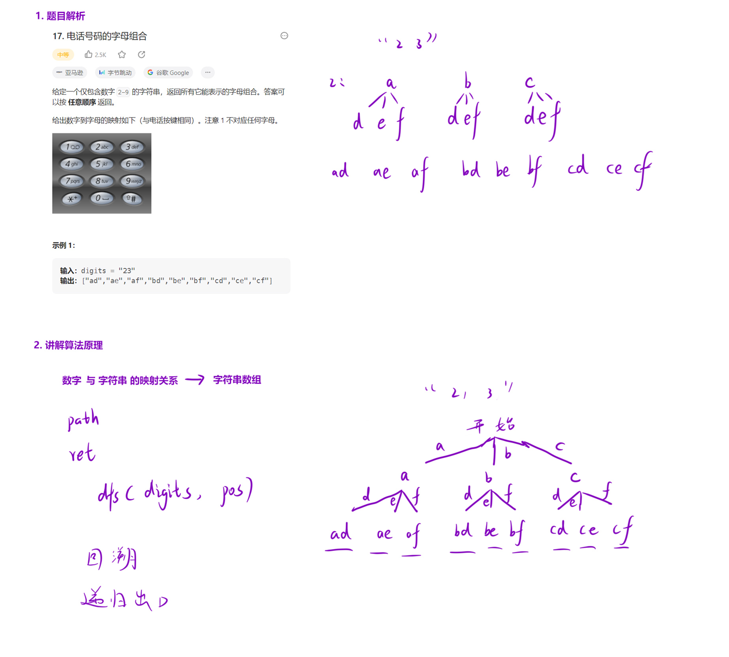 每个位置可选择的字符与其他位置不冲突,无需标记已出现字符,只需将每个数字对应的字符依次填入字符串进行递归,回溯时撤销填入操作。递归前需定义字典 phoneMap,记录 2 - 9 各自对应的字符。